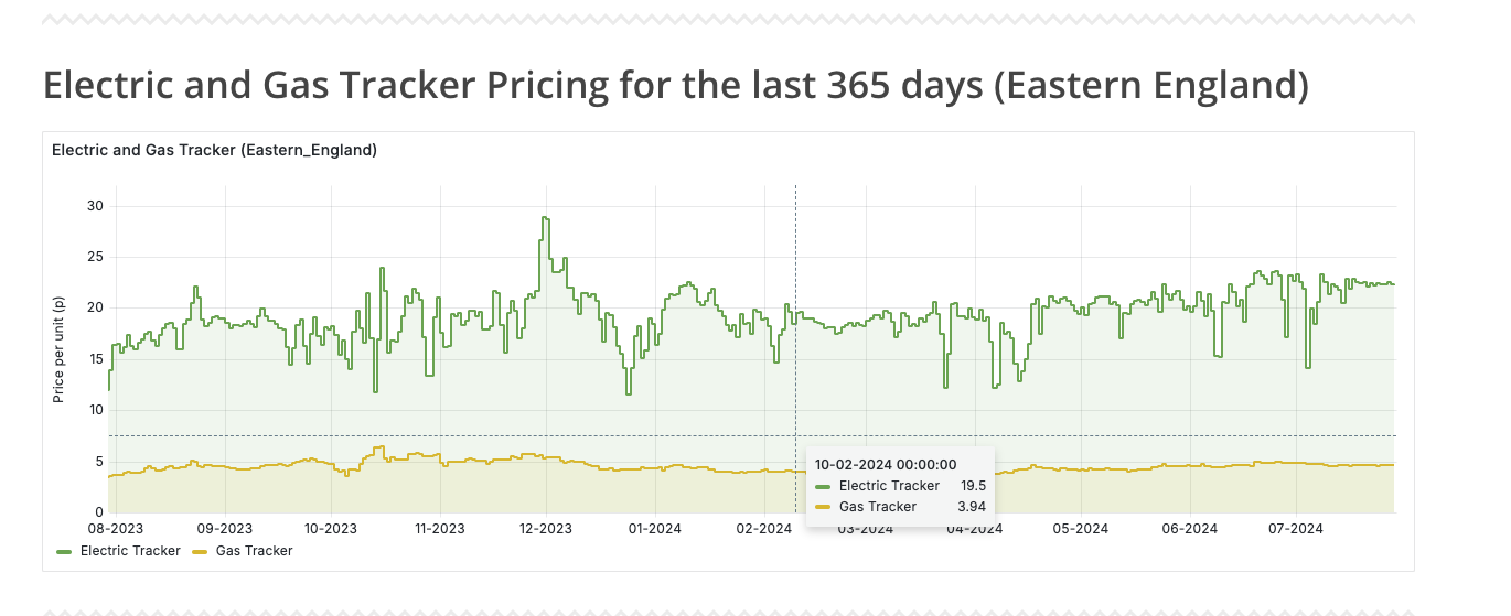 제가 이용하고 있는 Tracker Tariff는 그 날 그 날 전기 도매가로 가격이 정해집니다. 그래서 정해진 가격을 내는 일반 Tariff들 보다 쌀 수도, 비쌀 수도 있다는 게 장점이자 단점인데요. 대부분의 날은 Tariff보다 싸지만 아주 가끔 하루 이틀 정도 미친듯이 일반가보다 엄청 치솟을 수 있다는 것을 염두해두셔야합니다. 아래 두 이미지는 실제 Tracker 가격 히스토리 그래프인데요. 보다시피 아래로 훅훅 내려가는 경우가 있어 이때 밀린 세탁기, 건조기 등등을 싹 돌려주면 아주 바람직하고 그렇지 않다고 하더라도 보통 25-28p정도를 내던 것을 18-21p정도 내면 되니까 평소처럼 생활만해도 저처럼 몇 십 파운드를 절약할 수 있습니다.