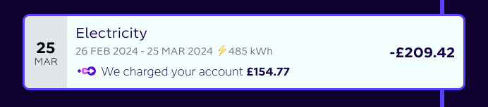 비슷하게 전기 사용한 5월과 2월말-3월말까지의 전기세 내역을 가져왔는데요. 5월 1일부터 26일까지 115.46파운드가 차지 되었지만, 이 요금제를 쓰기 전 2,3월에는 약 154.77파운드가 차지되었었습니다. 무려 39파운드 차이!
